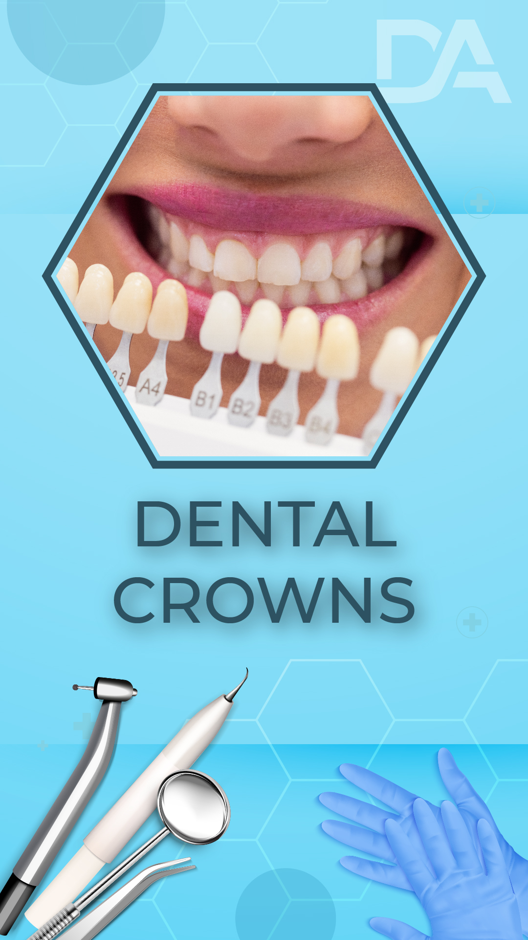 Dental crowns are prosthetic restorations that fully cover a damaged or weakened tooth, restoring its shape, strength, and natural appearance. They are recommended in cases of cracked, fractured, root canal–treated teeth or teeth with large fillings that no longer provide structural support.