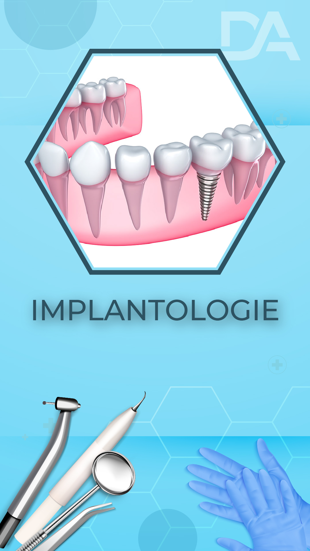 Implantologie – este o ramura moderna a stomatologiei care se ocupa cu inlocuirea definitiva a dintilor lipsa prin intermediul implanturilor dentare. Implantul dentar este un surub din titan (sau zirconiu), care se insereaza in osul maxilar si inlocuieste radacina unui dinte natural, oferind sustinere pentru coroane, punti sau proteze.